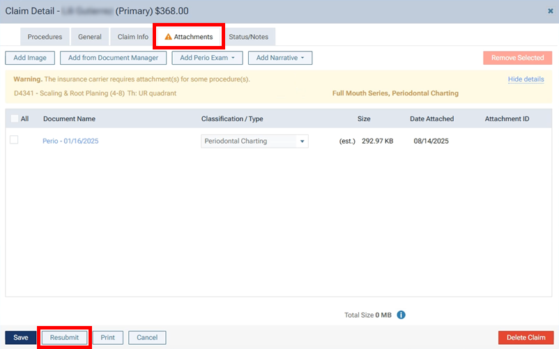 Select the Attachments tab, add the necessary attachment, such as a perio exam, and then click Resubmit.