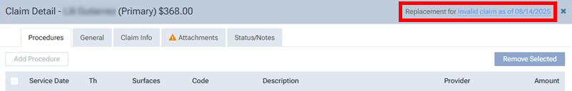 If you reopen the claim, in the upper-right corner, "Replacement for invalid claim as of [date]" appears (the date is the date that the claim was resubmitted).