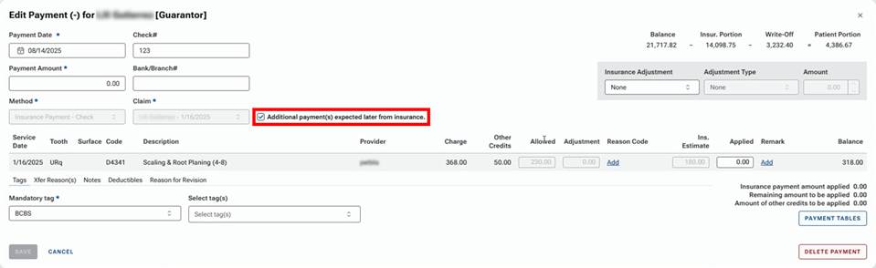 Make sure that the Additional payment(s) expected later from insurance checkbox is selected for the insurance payment.