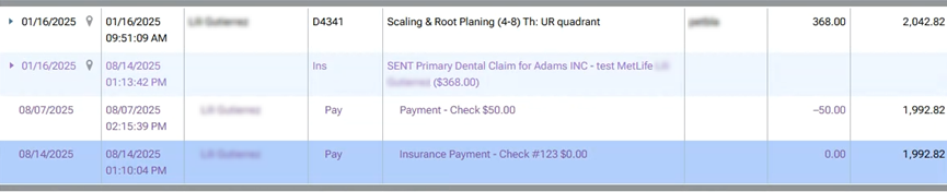A claim was sent, and then a zero-dollar insurance payment was entered.