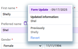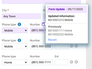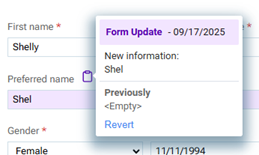 to view a pop-up box with the New information and the Previously entered information. To revert a value back to the previous value, click the Revert link on the pop-up box (the reverting is not saved automatically).Notes: