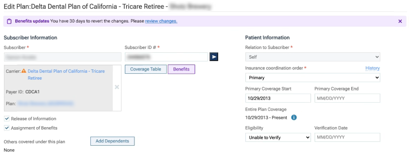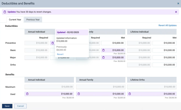 The options for editing insurance information become available. If met deductibles and used benefits have been updated due to an import within the past 30 days, you will see a purple Benefits updates notification, which explains that you have 30 days to revert any updates. Also, the Benefits button is purple.