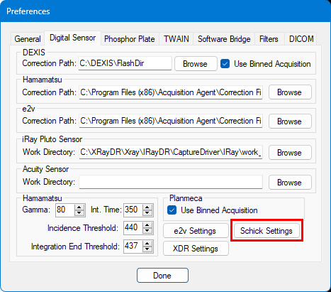 Open the acquisition agent preferences (click the icon in the system tray, and then select Preferences). Select the Digital Sensor tab. Then, click Schick Settings.