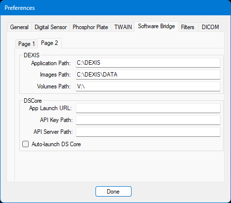 DSCore - If someone selects the DS Core software bridge from the device list when acquiring an image, the App Launch URL (the base URL of the DS Core website, where you log in), API Key Path (the API key that you generate for your account while logged in to the DS Core website), and API Server Path (the path for the API server associated with your DS Core account, such as https://api.r1.dscore.com) must be correct. To have DS Core launch automatically, the Auto-launch DS Core checkbox must be selected.