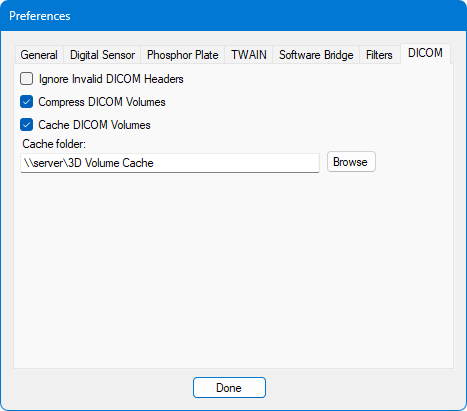Open the acquisition agent preferences. On the DICOM tab, if applicable for your needs, select the Compress DICOM Volumes and Cache DICOM Volumes checkboxes. Specify the Cache folder to be a shared folder with plenty of storage space so each computer can use the same cache for efficiency.