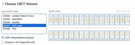 For a 3D acquisition, select an Acquisition type. Depending on the selected acquisition type, you may also need to select teeth for the test.