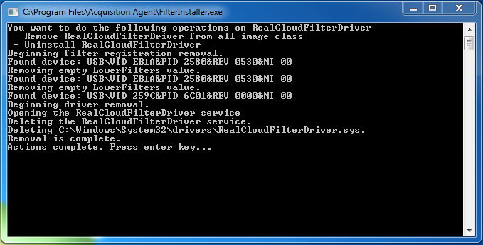 Make sure that the RealCloudFilterDriver.sys file was copied to the C:\Windows\System32\Drivers folder. If it was not copied try step 3 again. If the file still has not been copied, try copying it from the acquisition agent's installation directory (the default installation location is C:\Program Files (x86)\Aquisition Agent) to the C:\Windows\System32\Drivers folder.