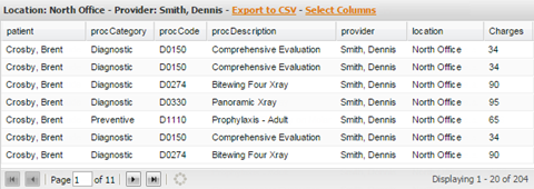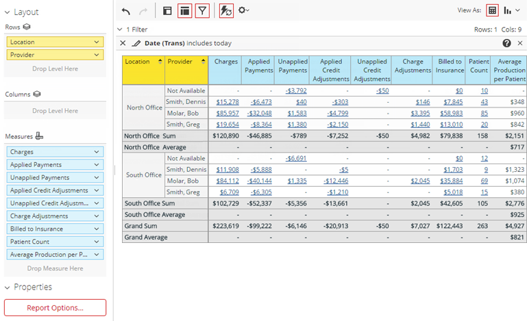 The Transaction Summary Report displays the sum of each transaction type by location and provider for the current day. The report includes a patient count and the average production per patient for each provider and location. Also, for most measures on the report, you can view the items that have been used in the calculation.
