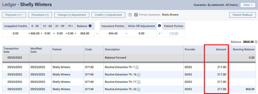 If the contracted fee was posted for a procedure, when you complete the procedure, that amount appears in the Amount column on a patient's Ledger page.