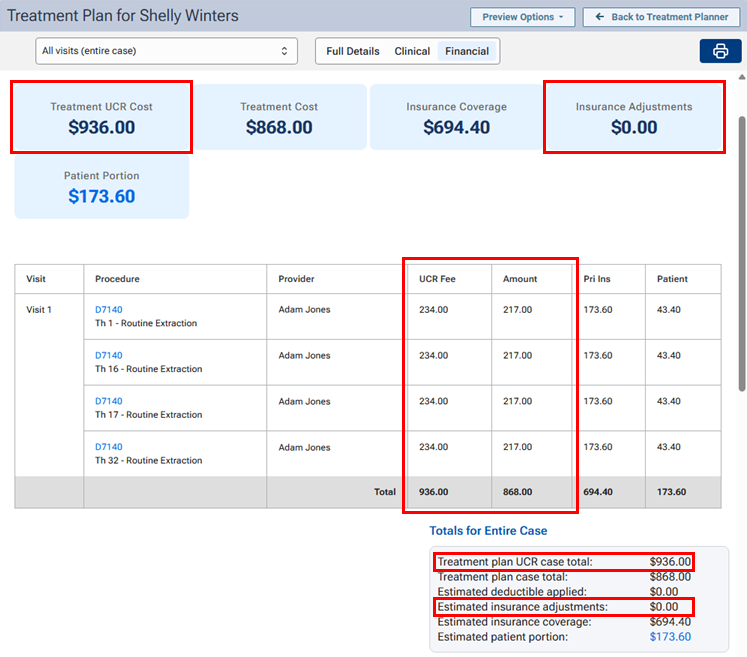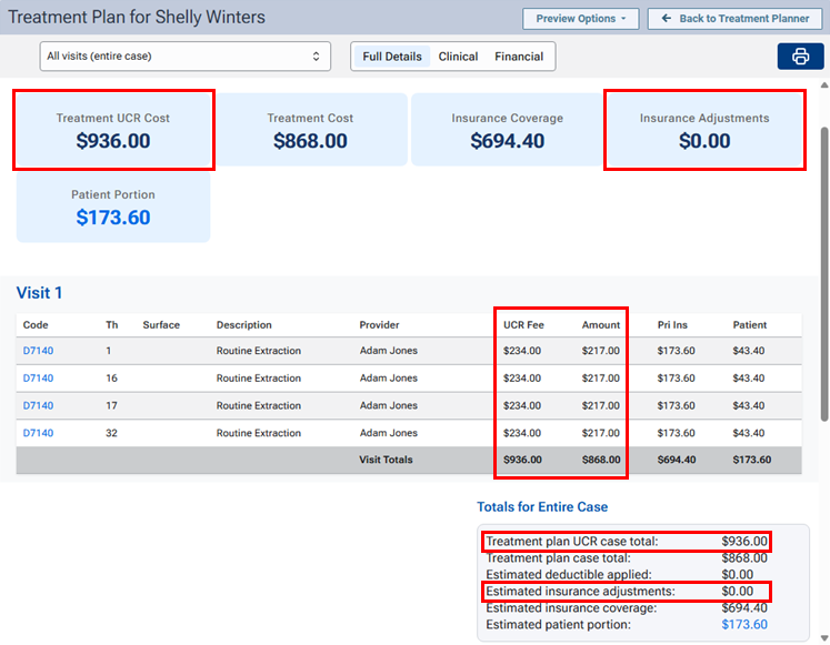 When you are presenting a treatment plan using the enhanced view, a UCR Fee column appears next to the Amount column, a Treatment UCR Cost box appears, and a zero-dollar amount (0.00) appears in the Insurance Adjustments box. Under Totals for Entire Case, a Treatment plan UCR case total appears, and a zero-dollar amount (0.00) appears for the Estimated insurance adjustments.