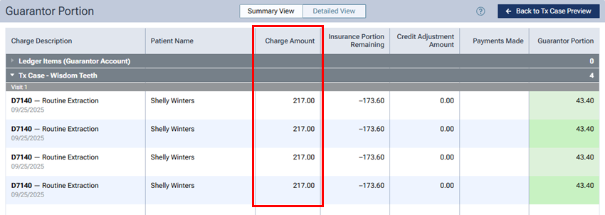 In the Summary View and Detailed View of the treatment plan preview, the Charge Amount equals the Primary Allowable Amount if the contracted fee is posted.