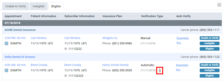 Note: For each appointment, the date of the last verification of eligibility for coverage and whether the verification was done manually or automatically appear for your reference. This information does not appear if a verification was never performed.