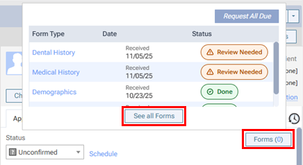 On the Chart tab of a patient's clinical record, click (or tap) Forms to view a pop-up box that displays the published patient forms that are applicable for the patient. If a form has a "Done" or "Review Needed" Status, click (or tap) the form's name in the Form Type column or the form's status icon in the Status column.