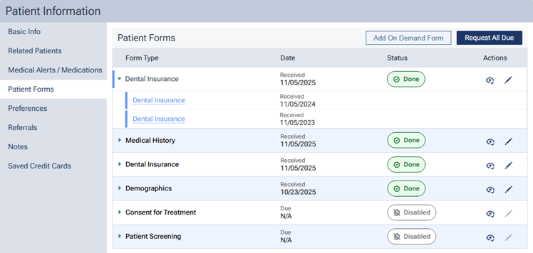 For a patient form completed prior to 08/2025 (using the legacy system), a "Last Received" date does not appear in Dentrix Ascend. You must submit that form using the new system for Dentrix Ascend to recognize the "Last Received" date. To edit the form's due date, select the red "Due now" link, and then select the applicable due date.