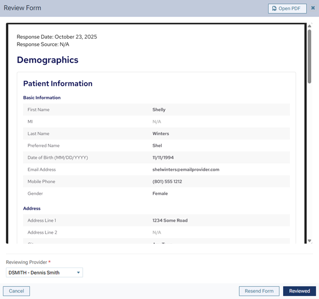 On a patient's Document Manager page, click (or tap) a document that has a "Forms" tag.