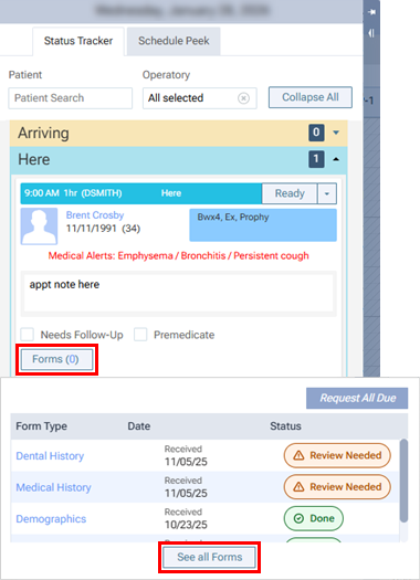 On the routing panel, locate a patient's appointment card, and then click (or tap) Forms to view a pop-up box that displays the published patient forms that are applicable for the patient. Do one of the following: