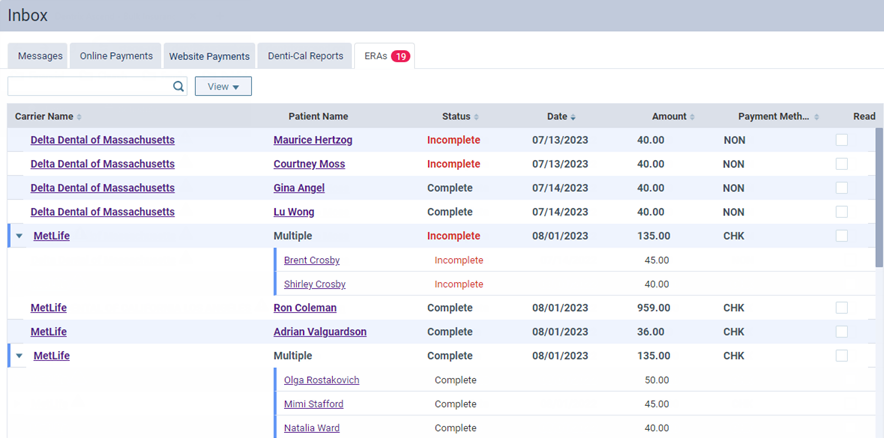 Note: For an ERA with multiple claims ("Multiple" appears in the Patient Name column), you can expand that ERA entry to view the corresponding claims.