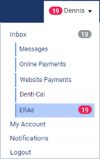 If the location that you are logged in to has unread ERAs in its inbox, a red dot with a number appears next to your user name on the User menu. The number on the dot indicates the total number of unread messages, online payments, Denti-Cal reports, and ERAs for that location.