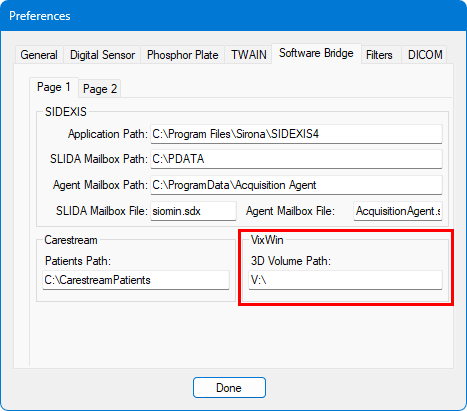 Select the Software Bridge tab. Leave the Page 1 tab selected. Under VixWin, in the 3D Volume Path box, specify the path to where the volumes are to be stored for VixWin.