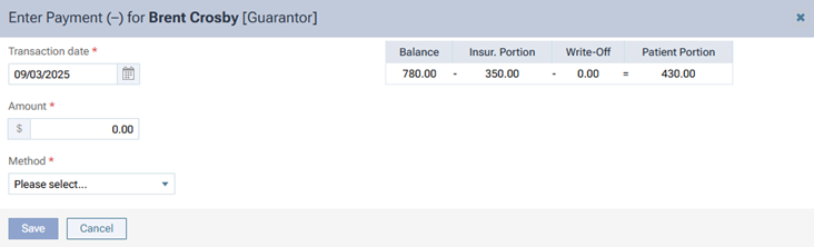 Select the Method of payment received from the patient (such as a check, cash, or credit card).
