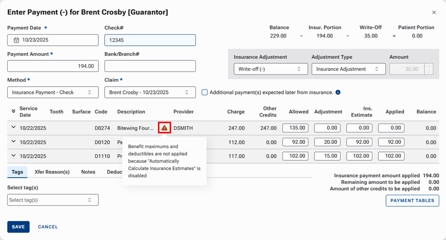 Also, when you are entering an insurance payment for a claim with this procedure, there is a warning icon and message that appears next to the procedure's description. The message states that the Automatically calculate insurance estimates switch set to Off, so the used benefit maximums and met deductibles are not updated.