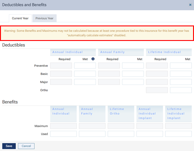 With this switch off for the procedure, if you view the Deductibles and Benefits dialog box for the patient’s insurance plan (Patient > Insurance Information, select the plan, and then click Benefits), there is a warning message. The message states that one or more procedures have the Automatically calculate insurance estimates switch set to Off, so some benefit maximums and required deductibles may not be used to calculate estimates.