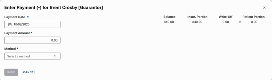 Apply to charges for - The payment goes towards charges for the patient whose record you are viewing or another member of his or her household. If you select [Guarantor], you can apply the payment to charges for any household members.