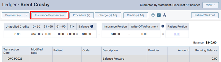 On a patient's Ledger page, click (or tap) Insurance Payment.