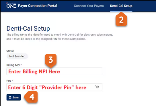 2. In the Payer Connection Portal, from across the top of the window select the "Denti-Cal Setup" tab.