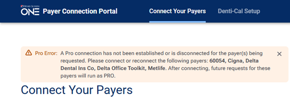Click Connect Payers to open the Payer Connection Portal page on a new browser tab. A message appears at the top of the page to remind you of which payers require connections.