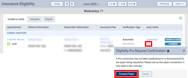 On the Insurance Eligibility page, when you click a Pro link, if the payer connection is missing, the Eligibility Pro Request Confirmation message appears. Click Connect Payer.
