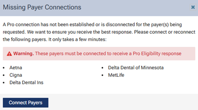 When you access the Insurance Eligibility page, if any payer connections are missing for the insurance carriers on this page, the Missing Payer Connections dialog box appears.
