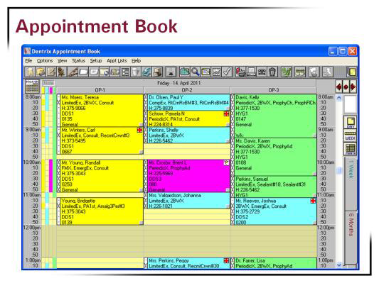 · Appointment Book - Managing appointments is easy with the Dentrix Appointment Book. The Appointment Book offers goal-oriented scheduling with the flexibility to make one-time changes. Appointment Book's convenient toolbars and Flip Tabs make navigating through the Appointment Book, searching for open times, and organizing appointments simple and quick. Appointment Book allows you to schedule appointments, record broken appointments, print route slips, and dial a patient's phone number directly from the computer. As with all the standard Dentrix modules, the Appointment Book provides access to other Dentrix modules from the toolbar.