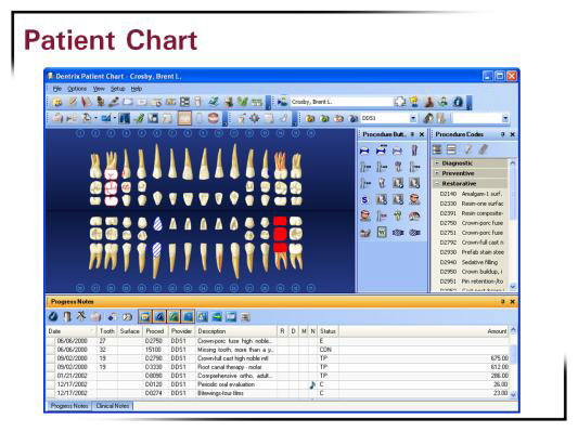 · Patient Chart - The Patient Chart module manages the clinical information for patients. The Patient Chart is a powerful, yet easy-to-use, application. The Chart allows you to post existing, completed, and recommended procedures using common textbook symbols. Additionally, the Chart helps users keep extensive and detailed notes regarding patient care. Several sub-modules of the Chart help users manage other clinical functions. The Dentrix Presenter is a unique case presentation program that displays the treatment plan costs in terms of primary and secondary insurance portions and the estimated patient portion. The Perio Chart is an unparalleled periodontal data maintenance tool.
