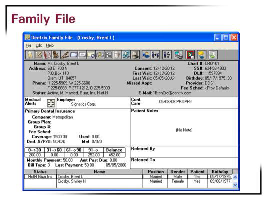 · Family File - The Family File module manages patient and insurance information. From this module you will keep track of a patient's name, address, employer, insurance information, notes, and continuing care, as well as other important information.