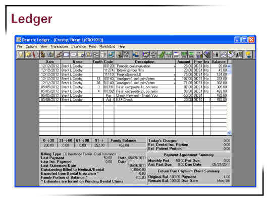 · Ledger - Patient accounts are managed in the Ledger. Because Dentrix is a seamlessly integrated system, procedures completed in the Patient Chart are automatically posted in the Ledger. All financial transactions are recorded in the Ledger, including charges, payments, and adjustments. The Ledger provides information concerning patient portion versus insurance portion, deductibles owed, and payment arrangements.