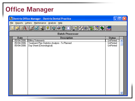 · Office Manager - The Office Manager offers useful, customizable reports including day sheets, aging reports, financial reports, patient lists, reference reports, and more. Additionally, the Office Manager integrates with Microsoft Word to create effective, professional-looking letters that are available at the click of a mouse. These letters include welcome letters, congratulatory letters, thank you letters, and a variety of appointment and continuing care (recall) reminders, progress reports, and collection notices. The Office Manager contains a set of utilities and commands that make customizing Dentrix easy.
