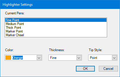 To change the settings for the highlighter, click the Highlighter button and from the menu, click Highlighter Settings.