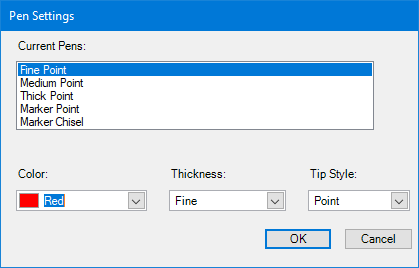 To change the settings for the pen, click the Pen button and from the menu, click Pen Settings.