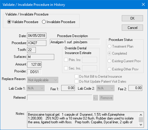 However, since the Patient Chart serves as a clinical record of patient care, it must be completely accurate. You should correct errors in the Patient Chart to reflect the actual care given; therefore, you can invalidate procedures in the Patient Chart that have been moved to history. Invalidating a procedure removes it from a patient's progress notes, while leaving it on the Ledger. If you discover a posting error after Dentrix moves a procedure to history, the following process is available to correct the mistake.