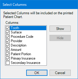 8. Select a column from the list, click Show or Hide to specify the columns that you want to appear in the patient's chart, and then click OK.