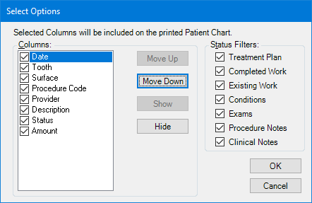 Note: From the Select Options dialog box, you can change the order of the columns by clicking Move Up or Move Down, and under Status Filters, you can select the patient information that you want to appear in the patient's chart