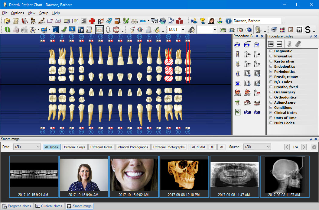 By default, the Dentrix Patient Chart window always opens in the Work Chart layout. The Work Chart layout is divided into four major areas: the Graphic Chart, the Progress Notes, the Procedure Buttons, and the Procedure Codes. From the Work Chart layout, you can enter treatment and conditions, chart existing and completed work, and manage treatment plans. You can also customize the Work Chart layout to fit your preferences. For example, you can modify the colour scheme, reposition or hide the panels, and customize the toolbars.