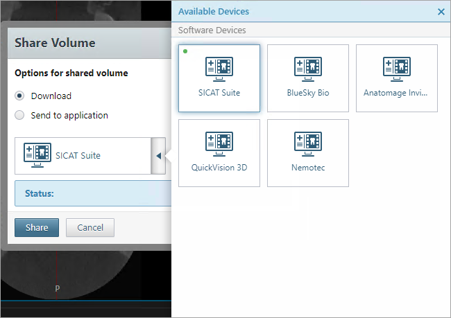 · You can use Owandy’s Quickvision 3D for sharing 3D volumes (exactly like SICAT and BlueSkyBio). When a 3D volume is loaded, the integrations are available for selection in Share. When selected, it bridges to Quickvision 3D and sends the 3D volumes.