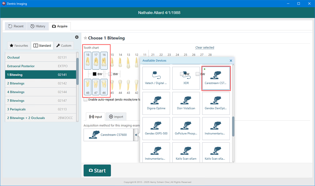 2. In the Standard list, click 1 Bitewing.