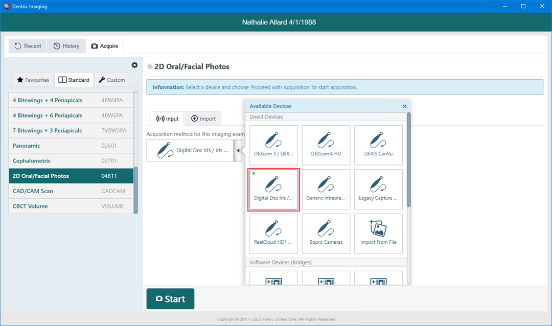 2. In the Standard list, click 2D Oral/Facial Photos.