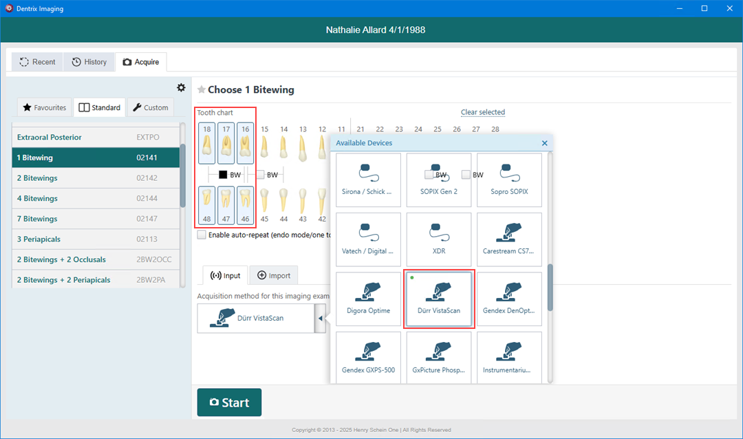 4. In the Acquisition method for this imaging exam menu, click Dürr VistaScan, and then click Start.