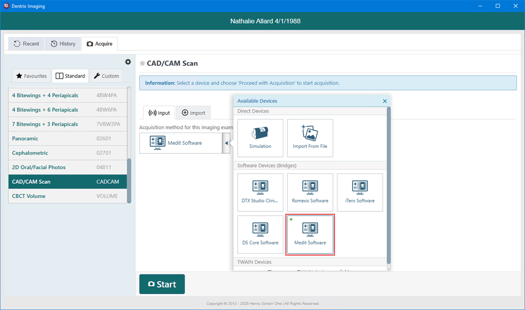 Dentrix Imaging supports acquiring intraoral scans from the MEDIT software bridge. You must install the Medit software on each Microsoft Windows workstation that uses the MEDIT software bridge.