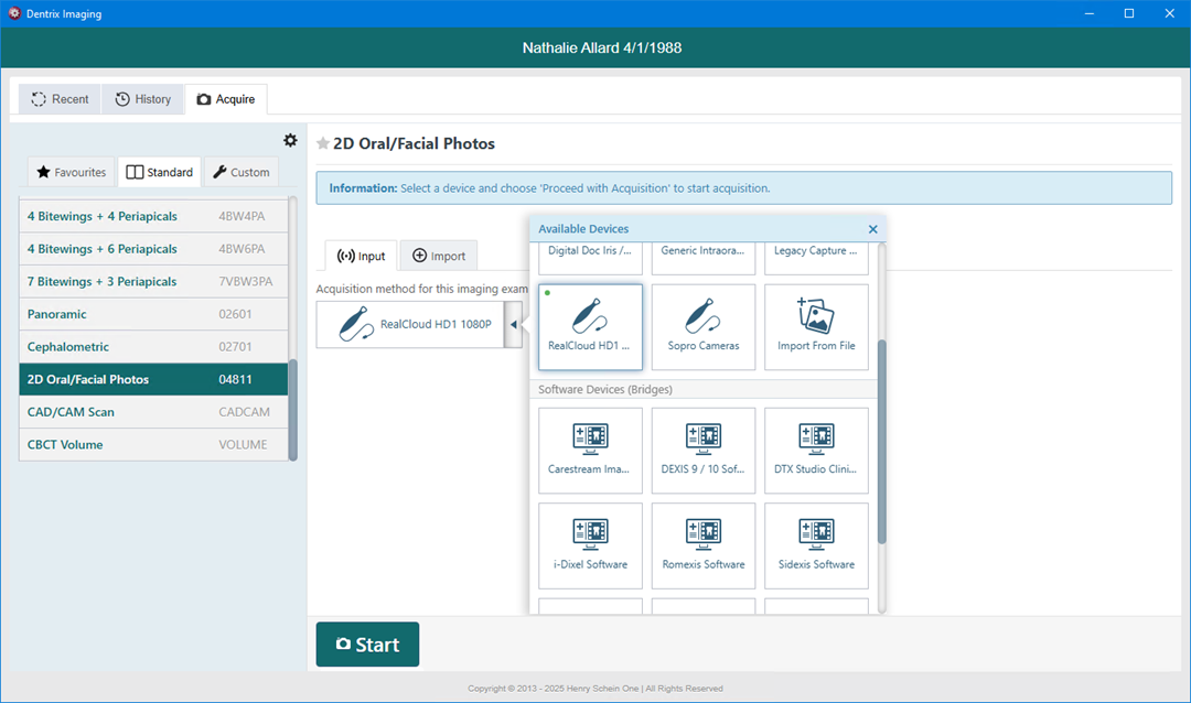 2. In the Standard list, click 2D Oral/Facial Photos.