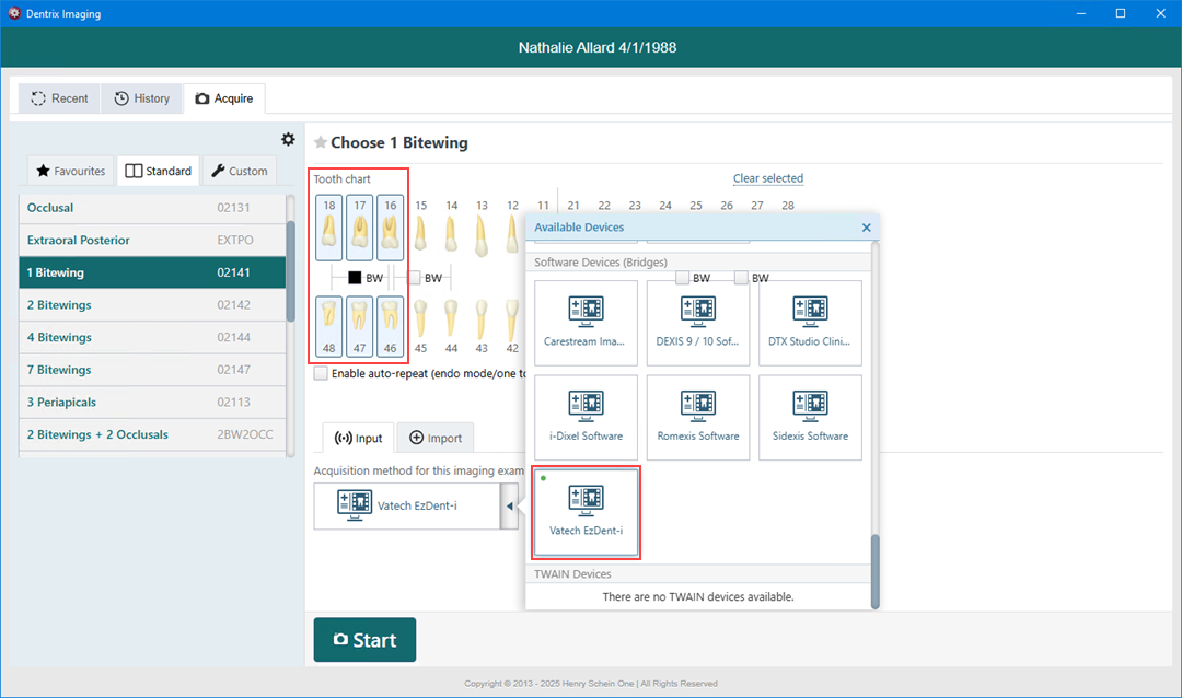 4. In the Acquisition method for this imaging exam menu, click Vatech EzDent-i, and then click Start.